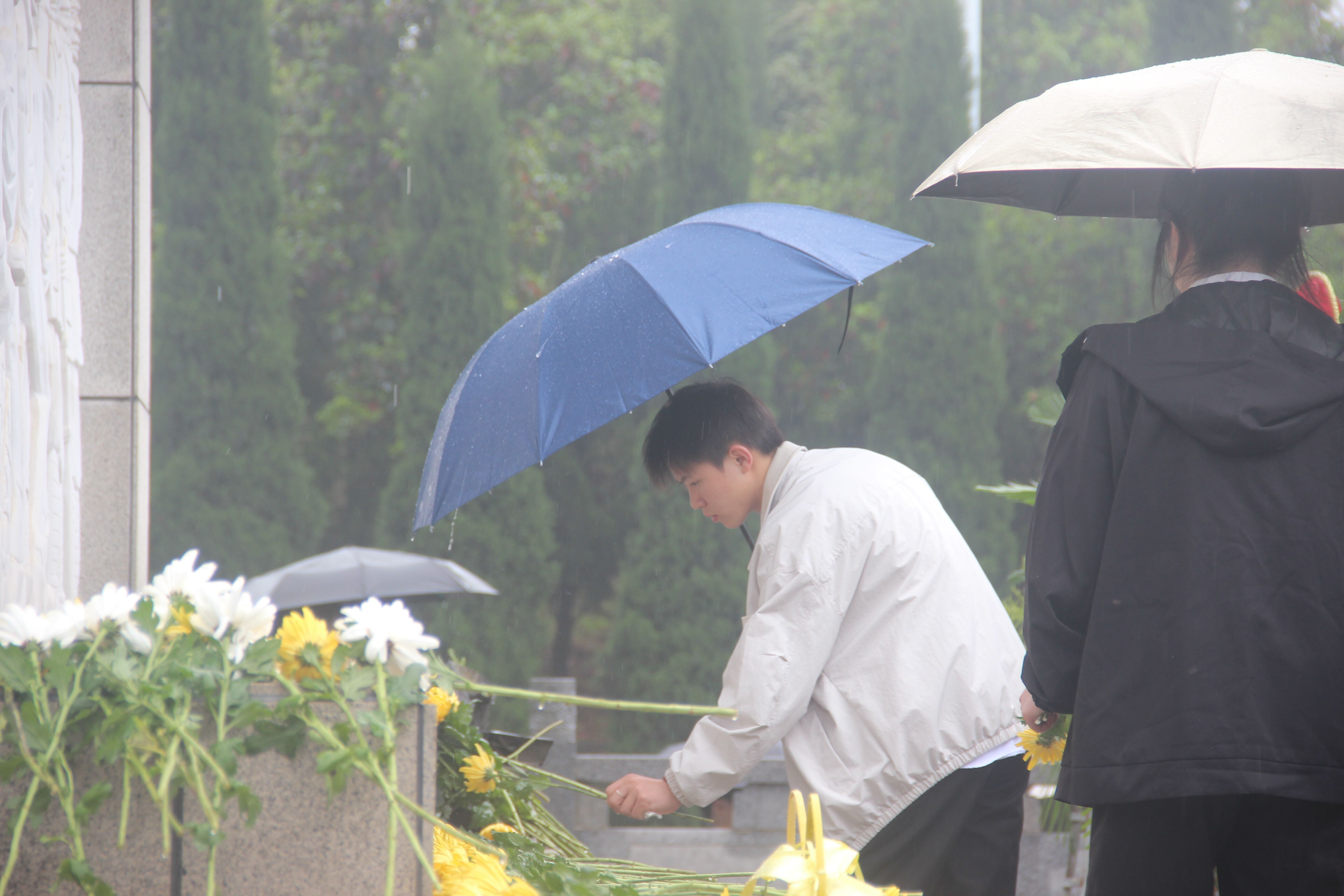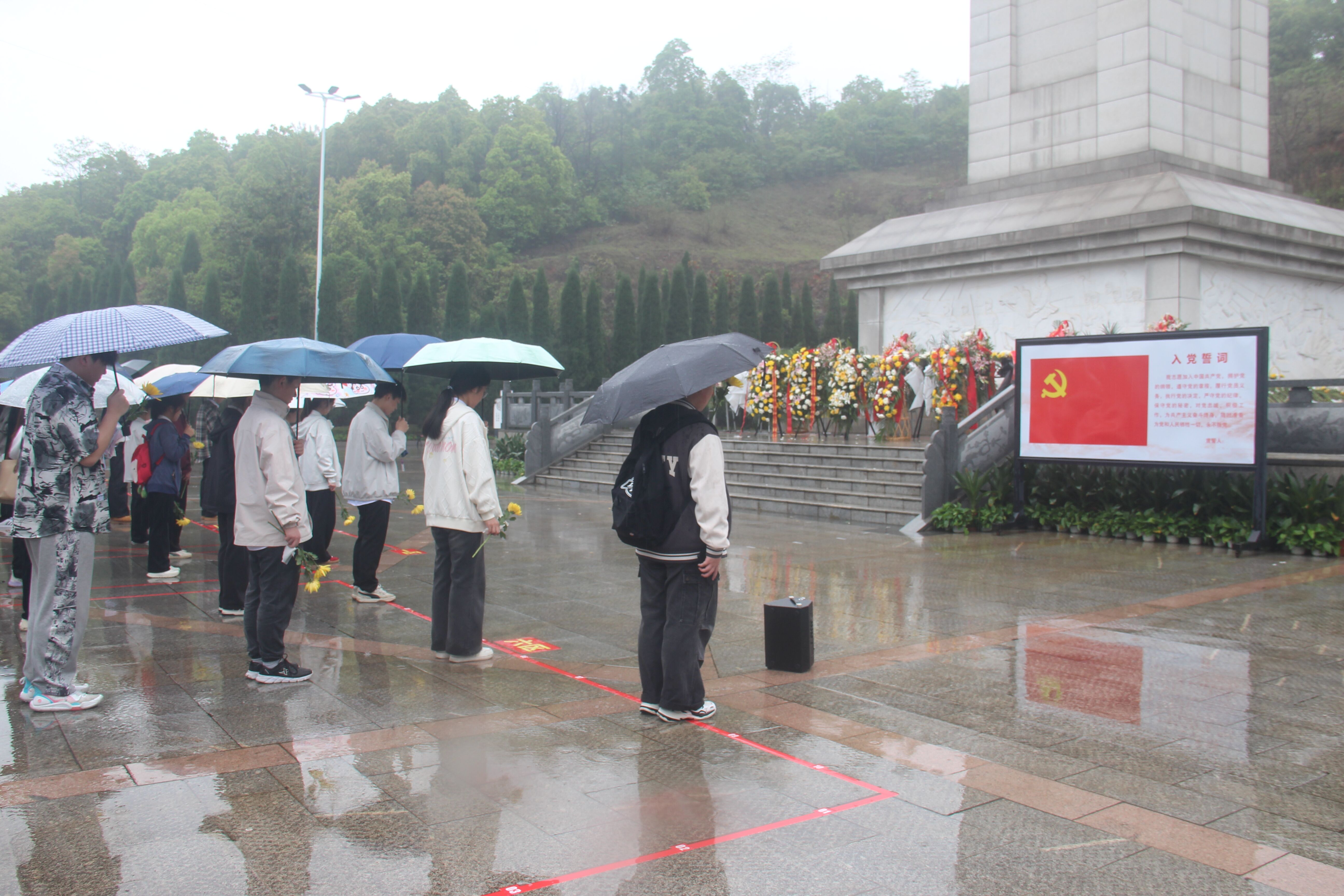 十点整,活动正式拉开帷幕。在雨中,全体党员身着整洁服装,整齐列队于烈士陵园纪念碑前。在毕业生党员的领誓下,党员们面向迎风飘扬的鲜红党旗,举起右拳,重温入党誓词。铿锵有力的誓言回荡在陵园上空,既是对革命先烈的深切告慰,更是对自身党员身份的郑重承诺。宣誓仪式结束后,全体成员缓步来到烈士纪念碑前。在低沉的哀乐声中,大家垂首肃立,为革命先烈默哀三分钟,以此表达对先烈们的无限敬仰和深切缅怀。默哀毕,党员们手持新鲜的菊花,依次走到纪念碑前,郑重地将菊花敬献在碑前,一朵朵菊花寄托着对先烈的哀思,也象征着革命精神的纯洁与不朽。