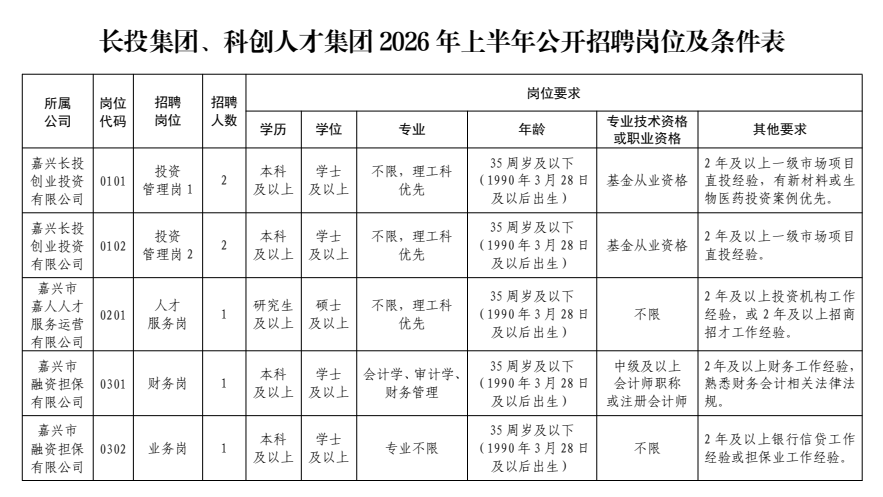 本次公开招聘推出岗位5个,计划招聘7人,具体招聘岗位、人数和要求等详见《长投集团、科创人才集团2026年上半年公开招聘岗位及条件表》。