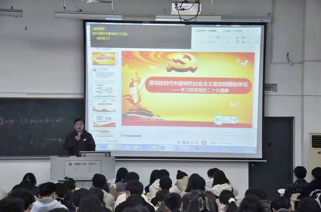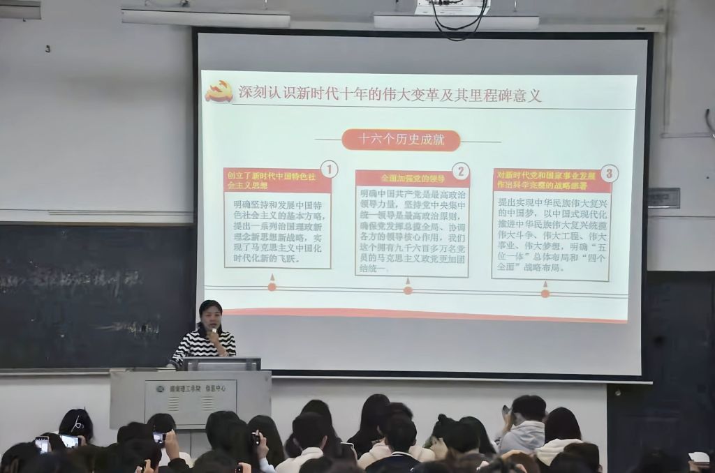 杜艳艳以《谱写时代中国特色社会主义更加绚丽的篇章》为主题展开专题讲座。她围绕“全面领会中国共产党第二十次全国代表大会的主题”“深刻认识新时代十年的伟大变革及其里程碑意义”“不断开辟马克思主义中国化时代化新境界”“牢牢把握新时代新征程中国共产党的使命任务”“贯彻落实新时代新征程的战略部署”“用新的伟大奋斗创造新的伟业”六个方面进行阐述。在讲座过程中,她立足中国立场,放眼国际视野,拥抱时代精神,结合历史发展、社会现象,从“三个务必”“六个坚持”“五个必由之路”等多方面向同学们深刻分析了党二十大的内容与精神,为同学们上了一堂既有理论高度和思想深度,又有知识广度和实践厚度的专题党课。讲座的最后,她引用习近平总书记在二十大中的演讲词激励在场学员,希望同学们能够自立自强、守正创新、踔厉奋发、勇毅前行,以咬定青山不放松的执着向前,为全面建设社会主义现代化国家、全面推进中华民族伟大复兴而团结奋斗。