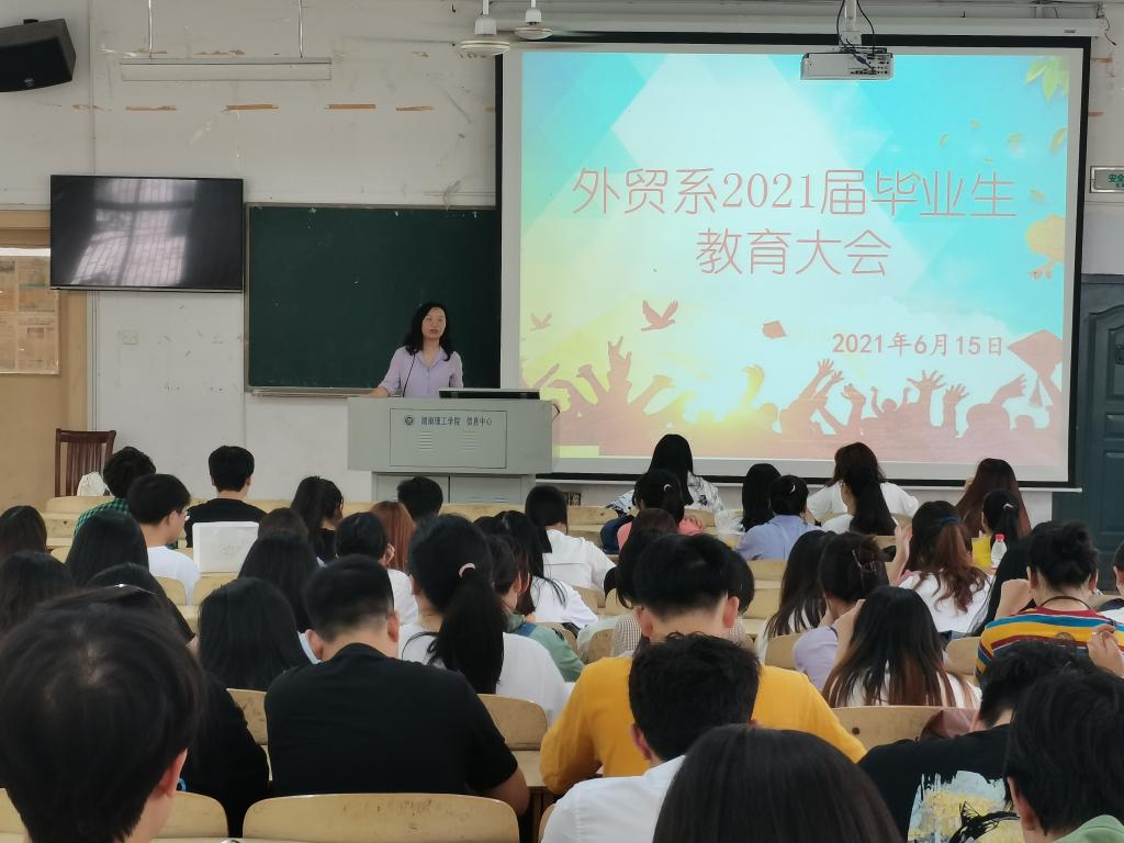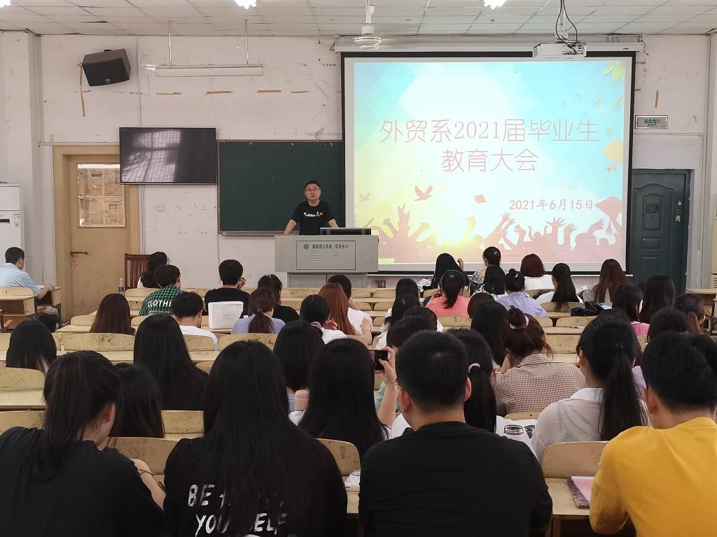 为激发毕业生报国成才之志,爱校荣校之情,感恩奉献之心,加强毕业生离校管理,营造文明、有序、和谐工作氛围,616日上午,外贸系在2T2教室举行2021届毕业生教育大会。外贸系主任毛新耕、系党总支书记陈涉出席会议,系党总支副书记、2021届毕业年级辅导员蒋智主持会议。
