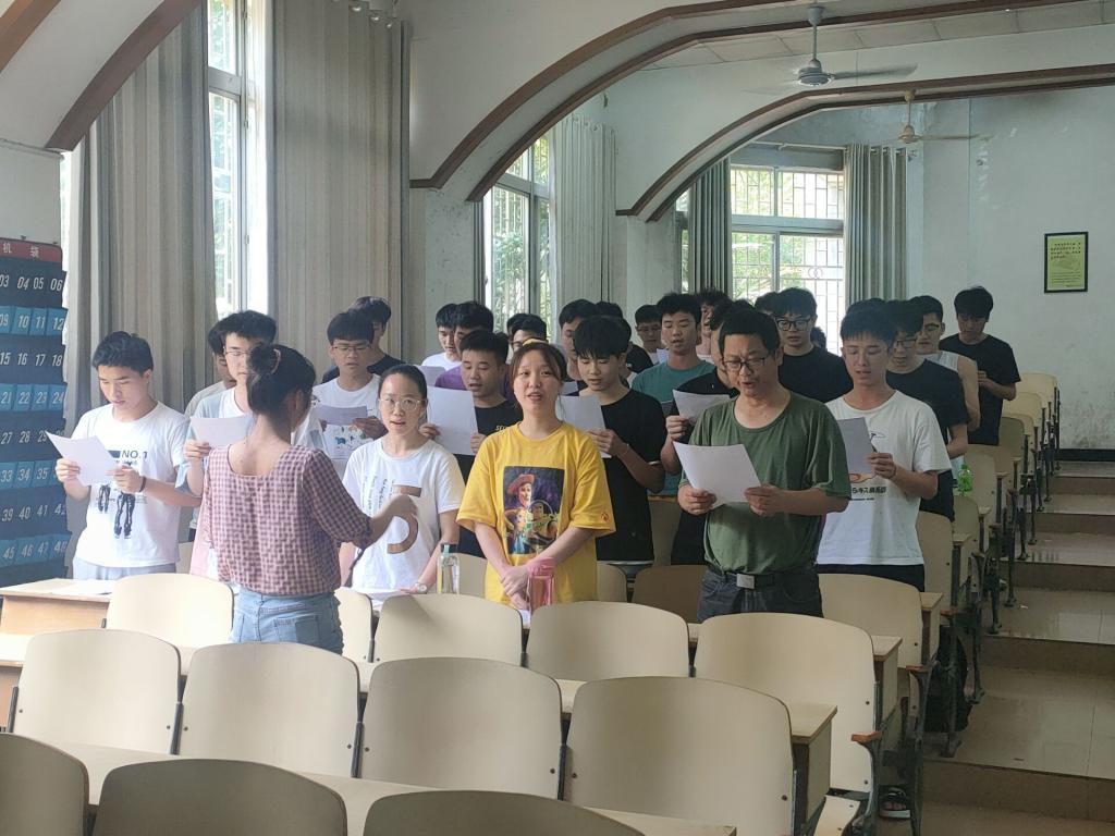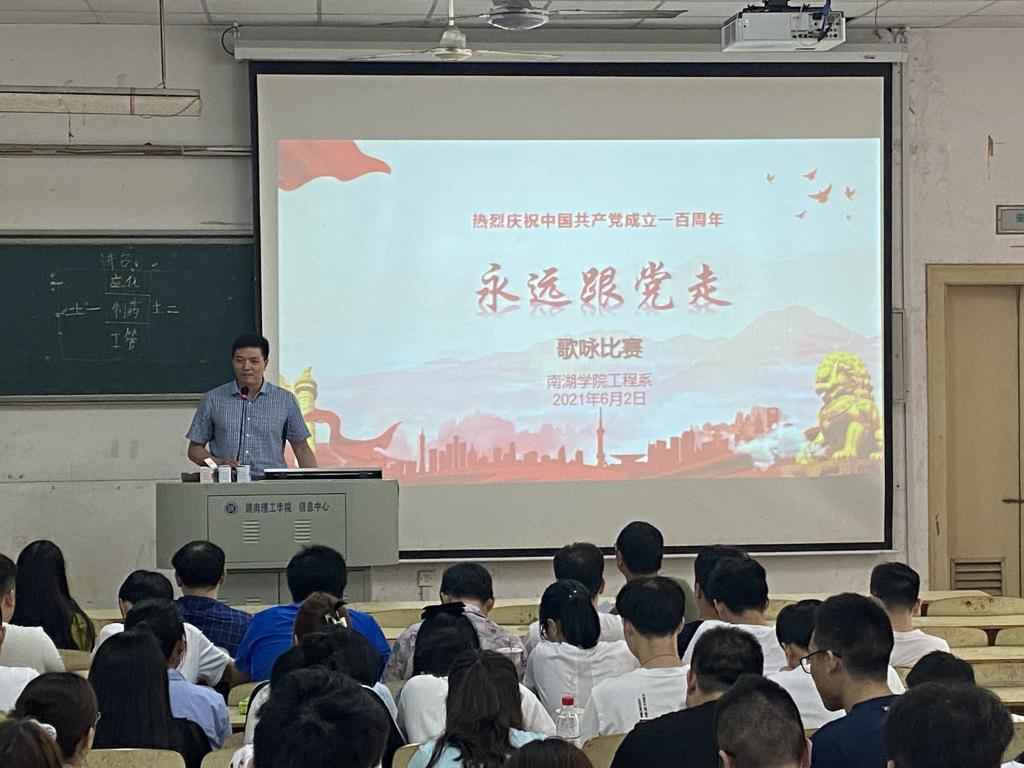 工程系于531日、61日、62日,在2T1教室分年级开展了永远跟党走歌咏比赛,今天开展了第三场(18级)比赛。党总支书记曾谦、副书记张殊歧、18级班主任代表彭楚才老师,以及音乐学院的两位学生教练担任评委,活动由团总支书记周彦辰主持。