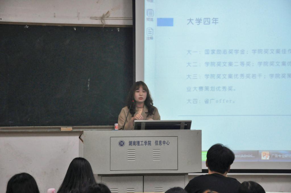 525日晚,文法系于2号教学楼2T2召开广告新闻专业榜样事迹报告会,19级辅导员黄琴老师出席会议,181920级广告班、新闻班全体学生与会。程锦玉主持本次报告会。