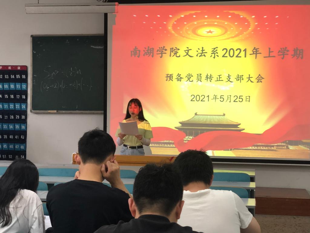5月25日下午,文法系学生党支部在2号楼2101教室召开预备党员转正支部大会。文法系党总支副书记贺青、教师支部宣传委员欧阳群力与会,文法系全体学生党员参会。保卫处副处长谭良机、学工部左竣老师作为学生入党介绍人特别到会。会议由贺青主持。