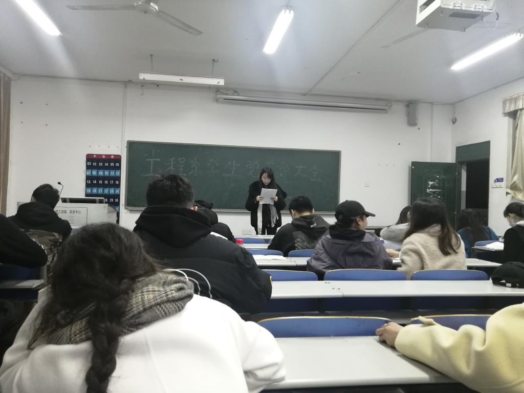 首先,工程系学生党支部书记张张殊岐老师传达了学校开学工作会议精神,通报了支委会关于本学期的支部工作要点与重点,并对我们全体党员同学提出了几点具体学习要求,第一是我们要有时间观念,参加会议要按时参加,如有特殊情况也要办好请假手续。第二是我们青年党员要加强对党史的学习,以史为鉴,传承历史,我们要有厚重的历史观。