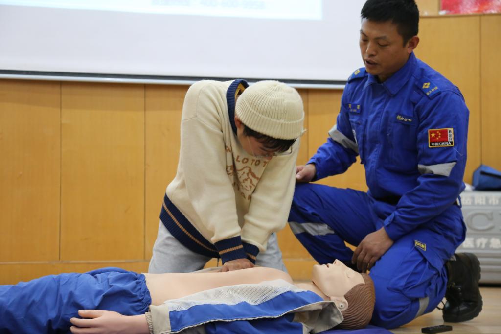 刘军讲解了心肺复苏术的具体措施、正确按压姿势与频率、深度及吹气比例,详细介绍了“海姆立克”急救法的操作步骤,并开展了现场假人示范教学,邀请了2名同学进行实操体验。