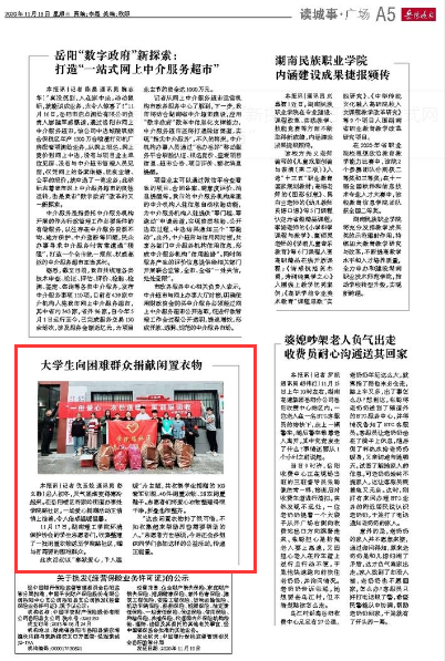 本次活动在东院及北院的宿舍楼下设点开展,共收集学生捐赠的10套军训服、40件闲置衣物、28双闲置鞋子,环境保护协会的志愿者们将其整理打包并一一做好登记,在1117日下午统一运送至岳阳楼区奇家岭街道办事处学院路社区,为在寒冬中的社区困难群众提供温暖。社区工作人员致信对经管系志愿团队的善举表达真诚感谢,同时期待推进与经管系长期合作,开展经常性的志愿服务活动。活动被“岳阳晚报”宣传报道。