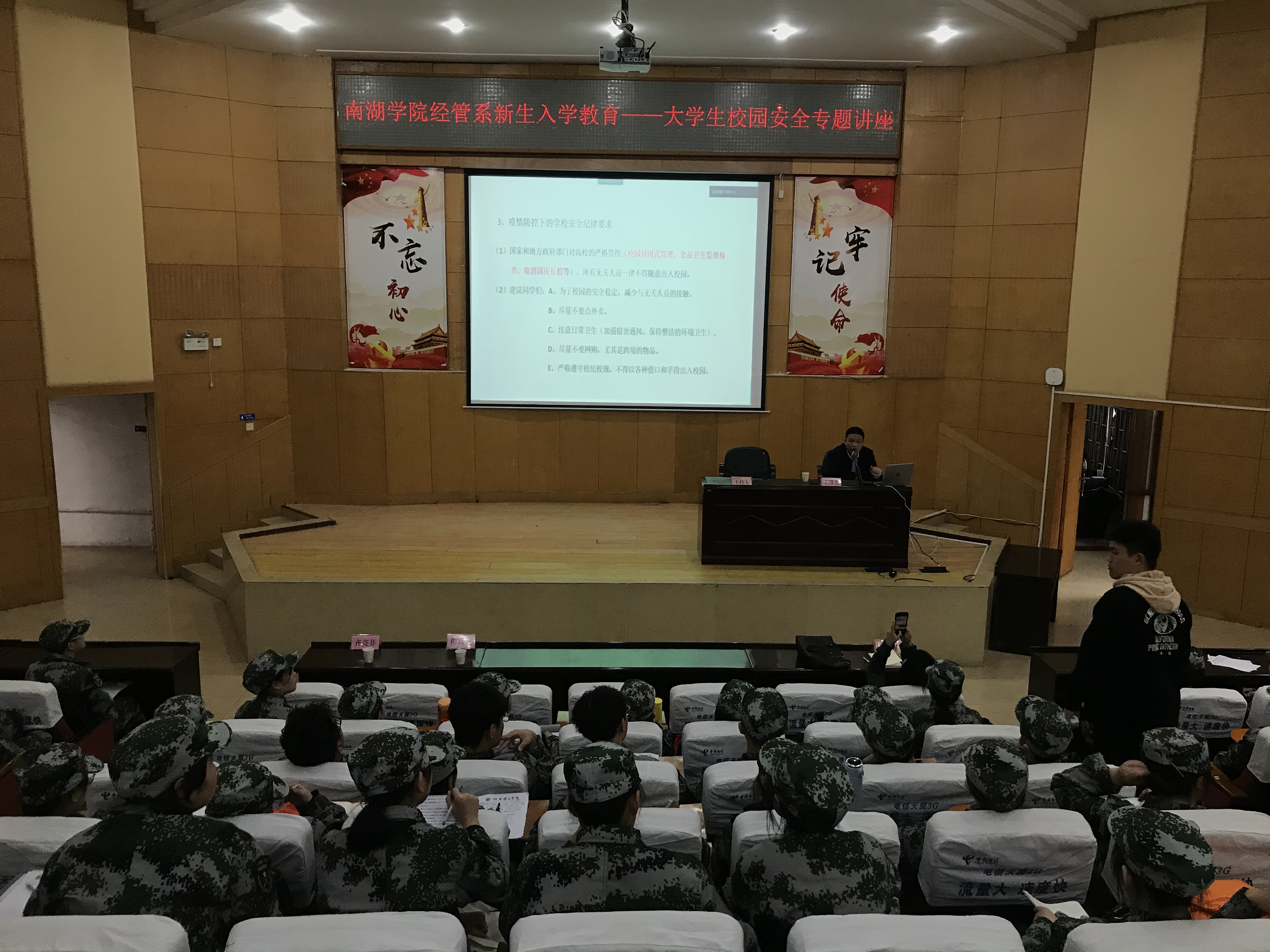 106日下午14:30,经管系于综合楼学术报告厅主会场及2T3教室分会场开展2020级新生入学教育——大学生校园安全专题讲座。学校保卫处副处长谭良机担任主讲嘉宾,经管系党总支书记齐亮菲、2020级新生辅导员晏妮、新生班主任助理及2020级全体新生参加讲座。