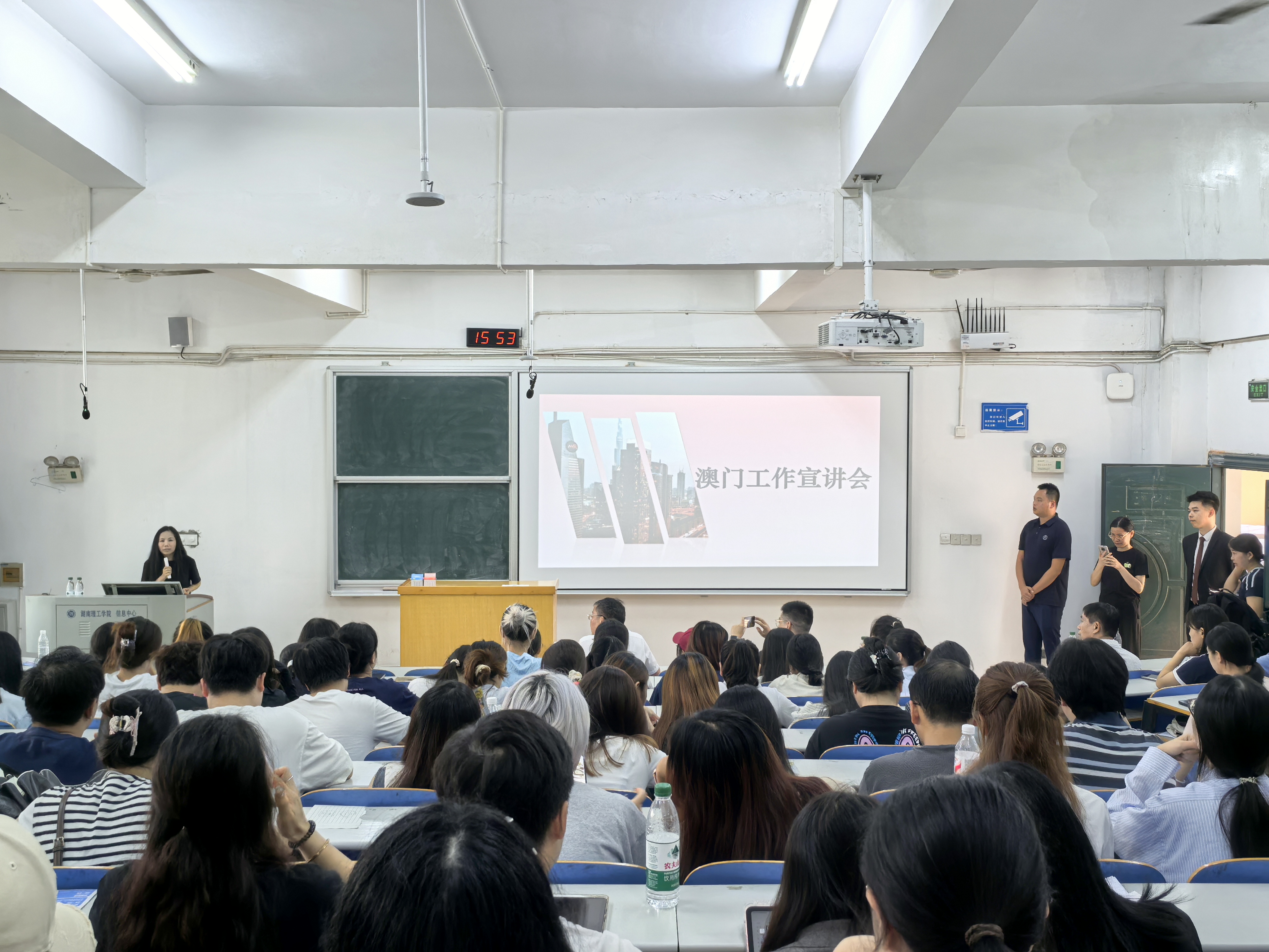 为拓宽毕业生就业渠道,搭建内地人才与澳门优质就业资源的对接平台,9月28日下午4点,外贸系在15417教室举行珠海国际(澳门)职业介绍所有限公司专场招聘会,珠海国际(澳门)职业介绍所有限公司副总经理周治国、招聘经理杨堉、张宇航,广东瑜渝科技发展有限公司总经理肖勇、副总经理谢再新、招聘专员肖凤,外贸系党总支书记刘青姗、2022级辅导员柳祎璇出席。外贸系2022级英语专业学生参加。