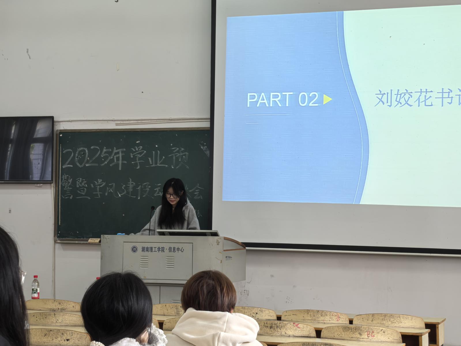 为切实加强学风建设,提升学生整体学业水平,帮助学生及时解决学业困难。我系于10月22日中午12:00在东院文学楼2T3教室举行2025年学业预警暨学风建设动员大会。经管系主任吴忠才、系党总支书记刘姣花、党总支副书记李鹏、学工办主任翁勇平、2022级辅导员江杨姬以及教学秘书朱浩波出席会议。全系所有欠修学分的同学参会,会议由团学会教信部张灿主持。