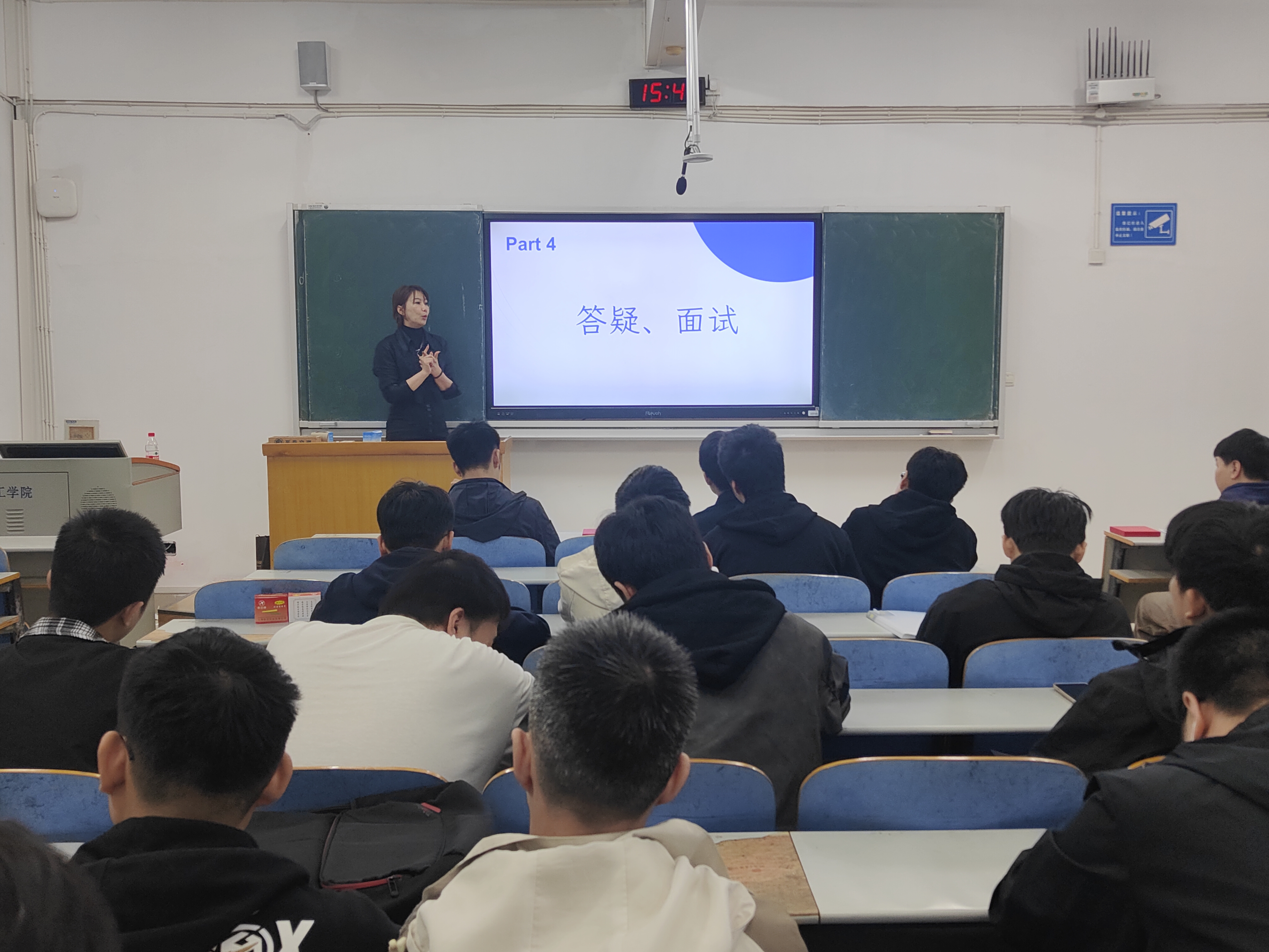 10月29日,15116教室内座无虚席,苏州苏勃检测有限公司专场宣讲会在这里如期举行,机电系党总支书记喻立平、2022级辅导员彭添宝参与本次专场招聘会。本次专场宣讲会由苏州苏勃检测有限公司人事总监潘现玮主讲。