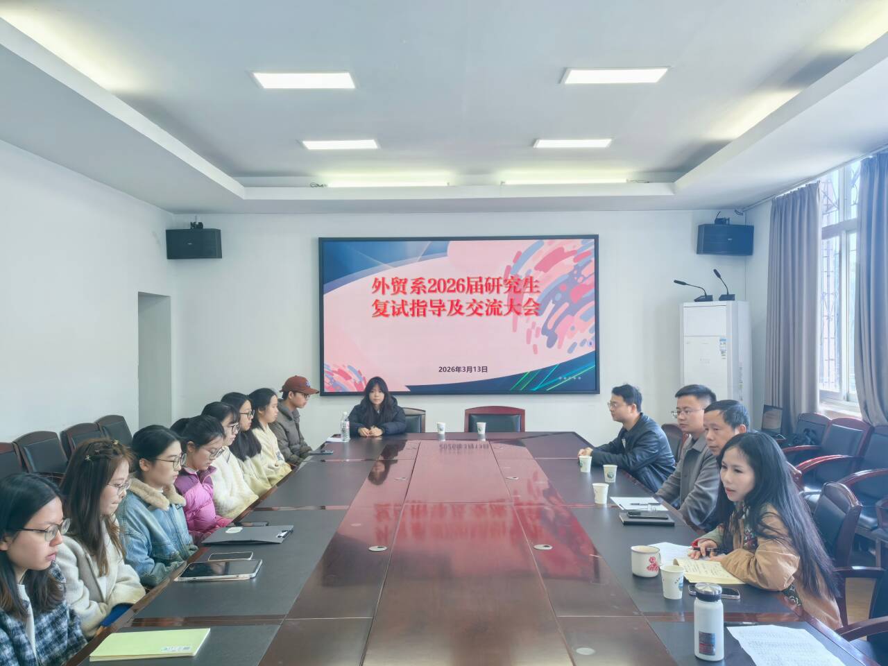为精准助力2026届考研学子冲刺复试、圆梦升学,切实提升应试能力与录取成功率,3月13日上午,外贸系在1221会议室举办2026年研究生复试指导与交流会。系主任毛新耕、系党总支书记刘青姗,22级辅导员柳祎璇,2021级上岸研究生代表出席会议,2026届考研上线学生参加。